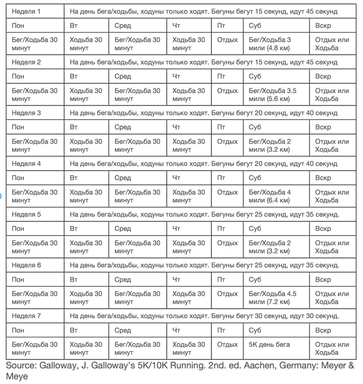Этот график, создан олимпийцем и включает смешание бега, ходьбы и отдыха. Комбинация помогает уменьшит риск повреждения, стресса и усталости, пока вы получаете удовольствие от физической активности. Помните, вы можете идти или бежать медленно, чтобы помочь вашему телу выполнить этот план тренировки.