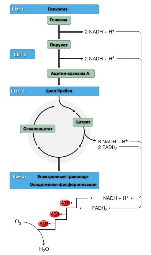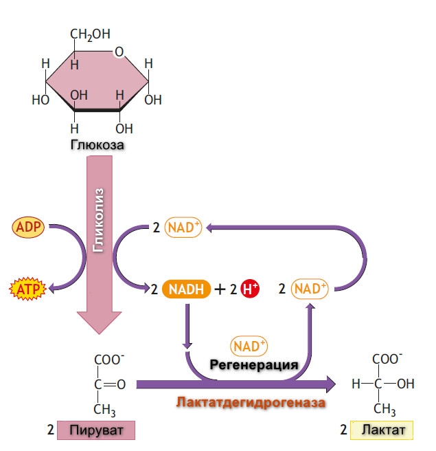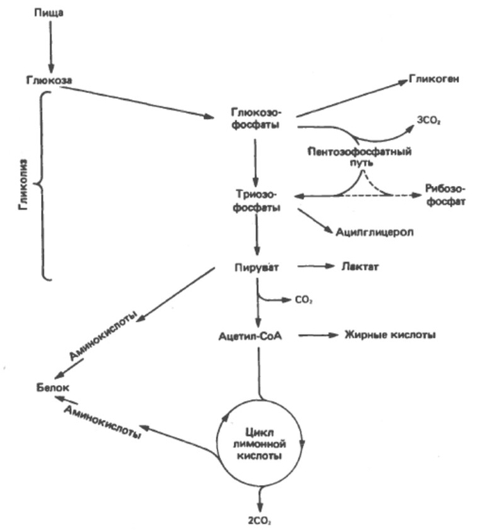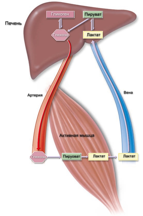 Обмен глюкозы в мышцах по сравнению с печенью носит редуцированный характер. Ведь печень обеспечивает углеводами все органы и ткани, а мышцы работают в соответствии с принципом самообслуживания. Здесь происходит создание запаса гликогена в состоянии покоя и использование его и вновь поступающей глюкозы при работе. Запасы гликогена в мышцах не превышают 1% от их массы. Основные энергетические потребности интенсивно работающей мускулатуры удовлетворяются за счет окисления продуктов обмена жиров, а глюкоза используется здесь в гораздо меньшей степени. В процессе гликолиза из нее образуется пируват, который утилизируют скелетные мышцы. При повышении уровня работы мышечная ткань вступает в анаэробные условия, производя пируват в лактат. Тот диффундирует в печень, где используется для глюкозного ресинтеза, а также может окисляться в миокарде, который практически всегда работает в аэробных условиях.