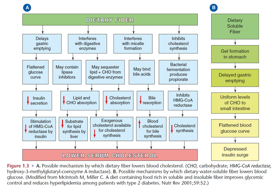 Рисунок ниже показывает возможные механизмы, которыми пищевые волокна снижают уровень холестерина в крови (А) и глюкозы (В)