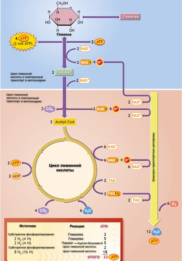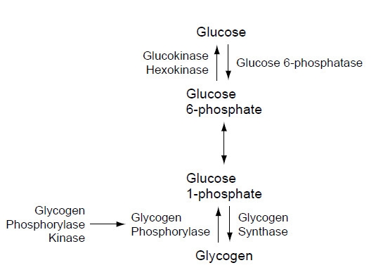 В цитоплазме печени и мышечных клетках содержатся гранулы гликогена и ферменты для синтеза гликогена (гликогенезис) и распада гликогена (гликогенолиз). При избытке глюкоза также вступает в энергетический метаболизм и откладывается в форме гликогена или конвертируется в жир. При высокой клеточной активности, доступная глюкоза окисляется через гликолитический путь, цикл лимонной кислоты и респираторную цепь с образованием АТФ. В противоположность, низкий уровень клеточной активности и/или недостатке гликогена, инактивируются ключевые гликолитические ферменты. Это заставляет излишек глюкозы преобразовывать в гликоген.