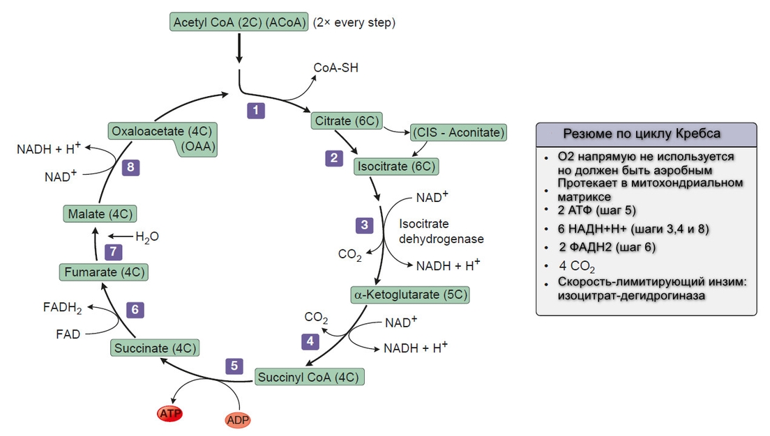Рисунок ниже описывает метаболический профиль во время пролонгированной нагрузке в условиях глюкозной нагрузки и глюкозной недостаточности. При прогрессировании субмаксимальной нагрузки при гликоген-обедненном состоянии, уровень глюкозы падает, а циркулирующих жиров (в основном в форме свободных жирных кислоты, СЖК, FFA) резко увеличивается, в сравнении с упражнениями при гликоген-нагруженных состояниях. Одновременно, вклад белков в энергетический расход растет. Интенсивность нагрузки (выраженная в процентах от максимума) также прогрессивно снижается при гликоген-обедненных состояниях. К концу 2-го часа, выполняющий нагрузку может поддерживать только около 50% от начальной интенсивности упражнения. Снижение мощности работы происходит из-за относительно медленного аэробного высвобождения энергии от окисления жиров, который теперь становится главным источником энергии. Любой из следующих семи ограничивающих скорость потенциальных метаболических процессов, которые предшествуют циклу Кребса могут объяснить относительно медленную скорость окисления жиров, по сравнению с углеводами: