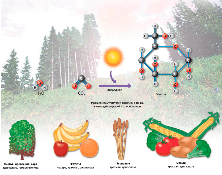 Рис1: Трехмерная кольцевая структура молекулы глюкозы формируется во время фотосинтеза из энергии солнца, взаимодействующей с водой, углекислым газом и зеленым пигментом растений хлорофиллом. Формула глюкозы (С6Н12О6).