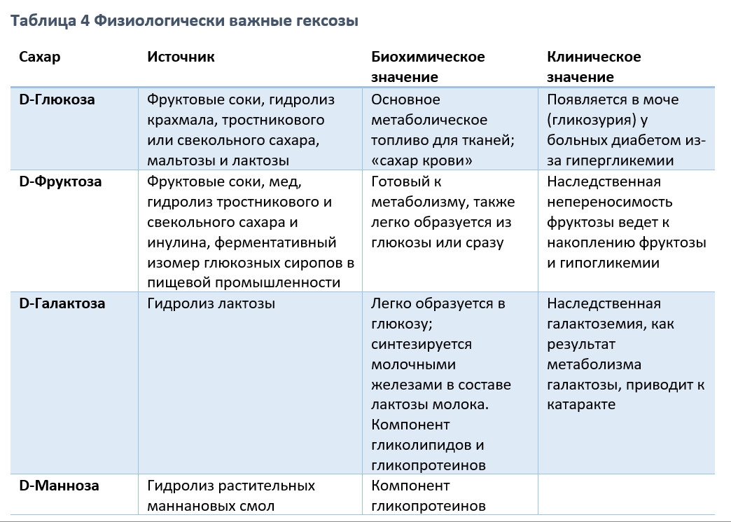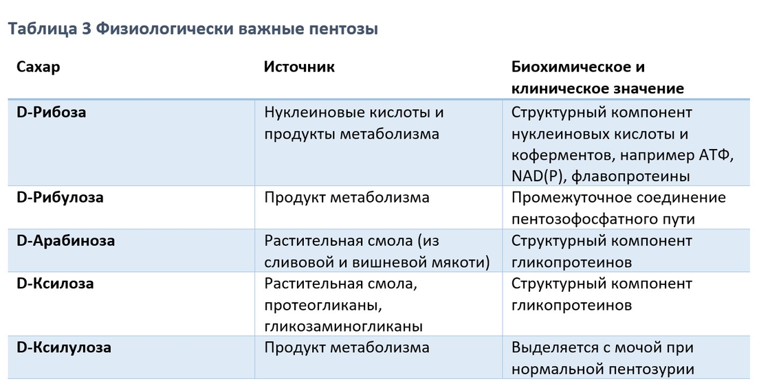 Метаболические превращения глюкозы по пентозофосфатному пути приводят к образованию приозводных триоз, тетроз и пентоз, а также к образованию семиугольного сахара седогептулозы. Пятиугольные моносахариды, пентозы, являются важными компонентами нуклеотидов, нуклеиновых кислот и многих коферментов. Из гексоз наиболее важное физиологическое значение имеют глюкоза, галактоза, фруктоза и манноза.