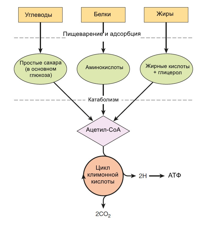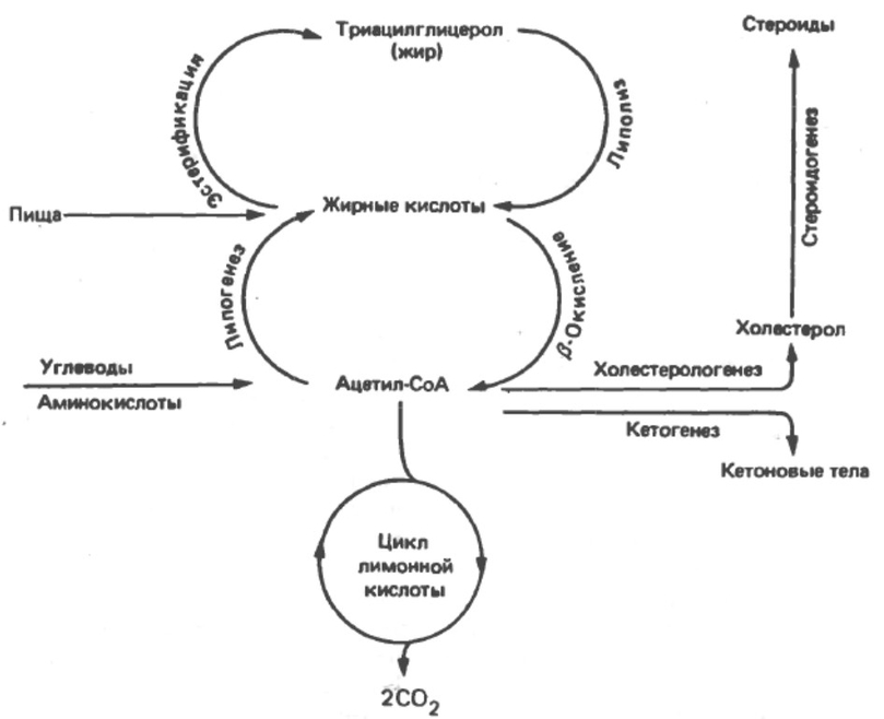 Компоненты распада углеводов служат «праймерами», субстратами для жирового окисления. Недостаточный распад углеводов – либо из-за ограничения транспорта глюкозы внутрь клетки (например, при диабете, когда снижается продукция инсулина или возрастает резистентность к инсулину) или распада гликогена из-за неадекватной диеты или длительной физической нагрузки – вызывает мобилизацию жира для повышенного окисления жиров. Недостаточное количество продуктов катаболизма гликогена приводит к неполному расщеплению жира с накоплением кетоновых тел (ацетоацетата и бета-гидроксибутирата, ацетоноподобных продукты неполного распада жиров). При повышении кетоновых тел повышается кислотность жидкостей организма, что вызывает потенциально опасное состояние, называемое ацидозом или, в частности, в отношении метаболизма жиров, кетозом.