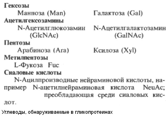 Гликопротеины (мукопротеины) - протеины, содержащие разветвленные и неразветвленные олигосахаридные цепи, включая фукозу. Они встречаются в клеточных мембранах. Сиаловые кислоты - производные нейромидиновой кислоты. Сиаловые кислоты являются компонентом гликопротеинов и ганглиозидов.