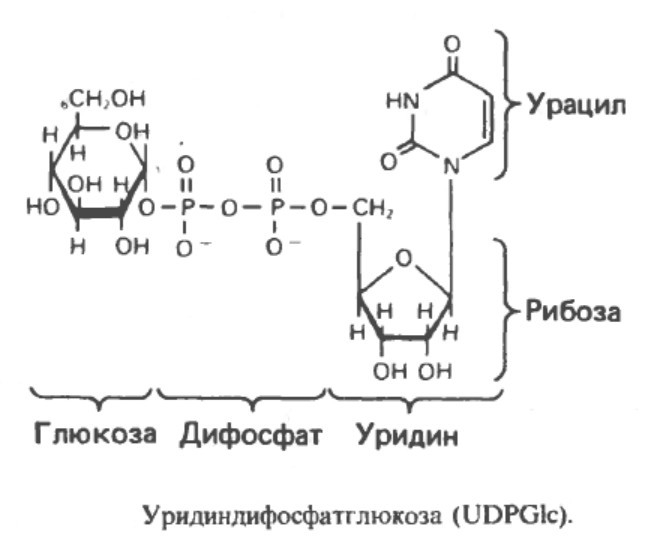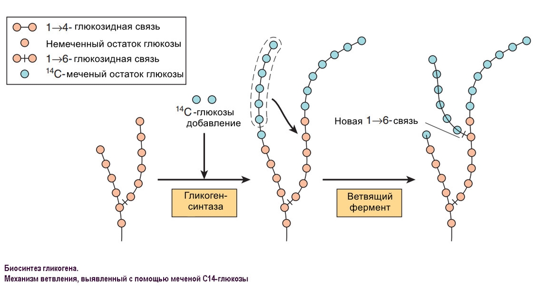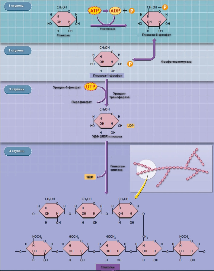 Гликоген – это углевод, откладывающийся в печени и мышцах млекопитающих. Это большой полисахаридный полимер, синтезируемый из глюкозы в процессе глюкогенеза (катализируемый ферментом гликоген-синтетазой). Неправильной формой гликоген насчитывает от нескольких сотен до 30 000 молекул глюкозы, соединенных вместе, с ответвлениями для присоединения дополнительных молекул глюкозы. Его компактная структура образует плотные гранулы внутри клеток, которые различаются в структуре и локализации внутри клетки, метаболической регуляции и ответе. Эти гликосомы содержат гликоген и протеины, регулирующие его метаболизм.