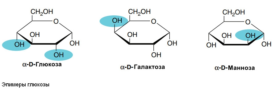 4. Эпимеры. Изомеры, различающиеся по конфигурации положением групп -Н или -ОН при 2, 3 или 4 атомах углерода, называются эпимерами. Биологически наиболее важными эпимерами глюкозы являются манноза и галактоза, образующиеся путем эпимеризации при атомах углерода 2 и 4 соответственно.