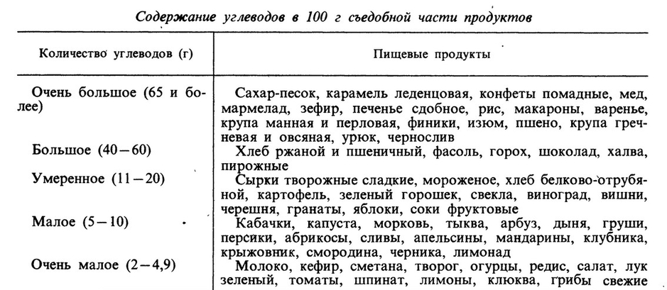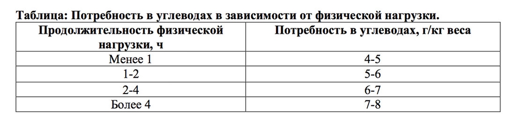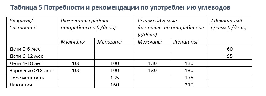 Потребность в углеводах для девушек составляет в среднем 360 г, для юношей - 400 г в сутки. Минимальное количество углеводов в пищевом рационе не должно быть ниже 50-60 г. Дальнейшее снижение количества углеводов ведет к нарушению обменных процессов в организме, в том числе к использованию в качестве энергетического материала тканевых белков (в первую очередь мышечных).