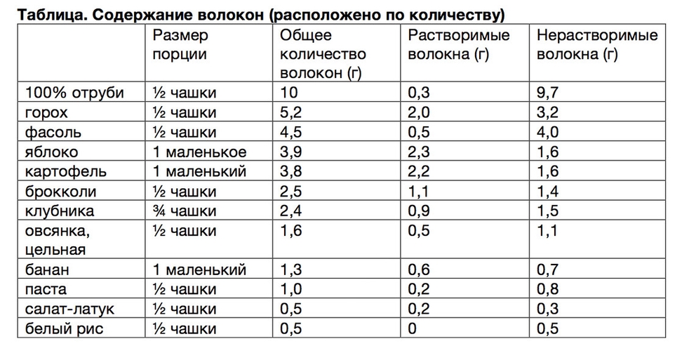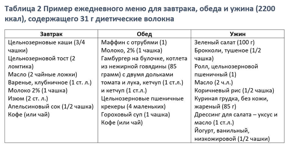 В таблице 2 представлено еждневное меню на 2200 ккал, которое включает 31 г волокон (21 г нерастворимых волокон).