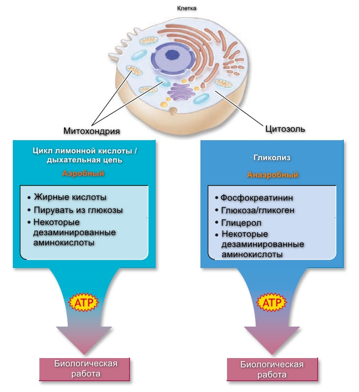 Гликоген, запасенный в активной мускулатуре, обеспечивает почти всю потребность в энергии от покоя до умеренной нагрузки. Во время следующих 20 минут, печень и мышечный гликоген дают от 40 до 50% необходимой энергии, остальное обеспечивает катаболизм жиров и ограниченное количество белков. По сути, смесь источников энергии зависит от