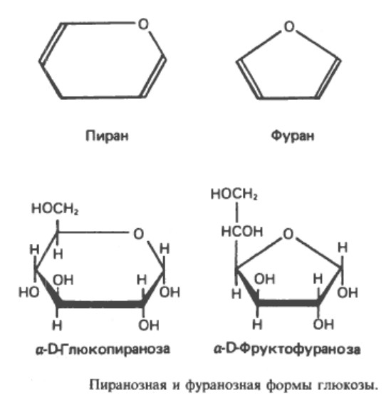 2. Пиранозные и фуранозные кольцевые структуры. Эта терминология основана на существовании устойчивых кольцевых структур моносахаридов, сходных со структурами пирана или фурана. Для глюкозы 99% молекул находятся в пиранозной форме и менее 1% - в фуранозной форме.
