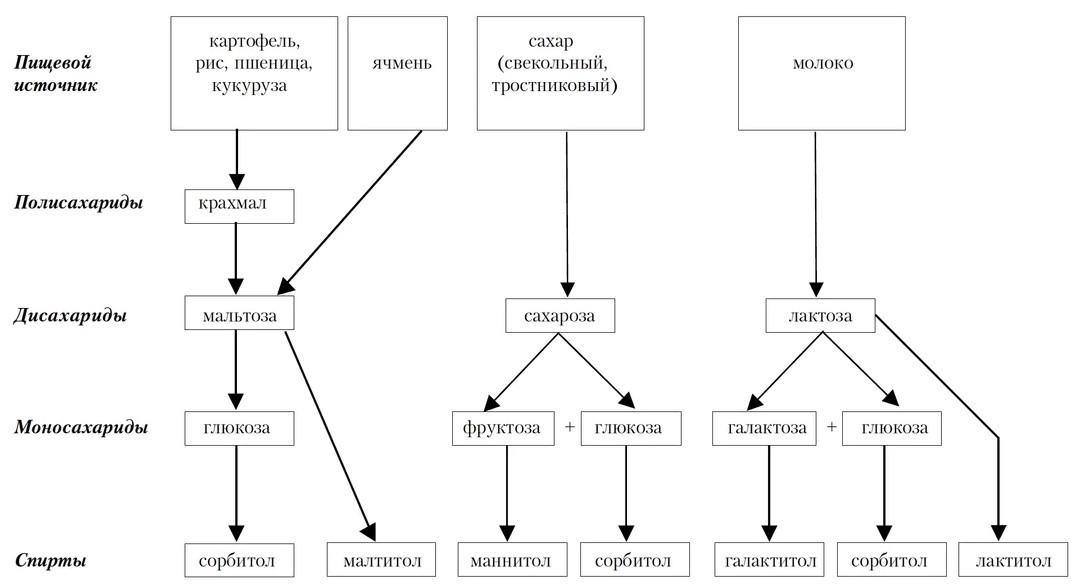 -- сахароза (глюкоза + фруктоза) - наиболее частый диетический дисахарид (свекольный, тростниковый сахар, коричневый сахар, сорго, кленовый сироп, мед);