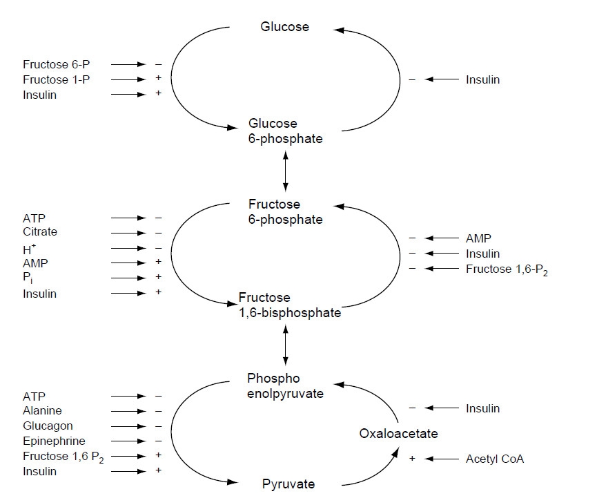 На рисунке выше регуляция гликолиза и гликонеогенеза в печени