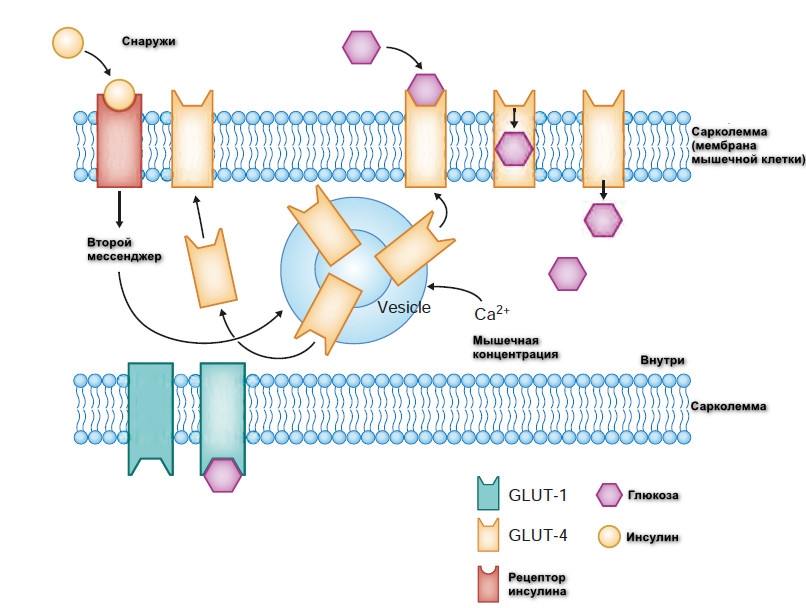 GLUT 4. Эти транспортеры, в ответ на инсулин и физическую нагрузку (независимую от инсулина) мигрируют из везикул внутри клетки в плазматическую мембрану. Их деяетльность обеспечивает транспорт глюкозы в саркоплазму, где в последствии катаболизируется до АТФ. Другой транспортер,