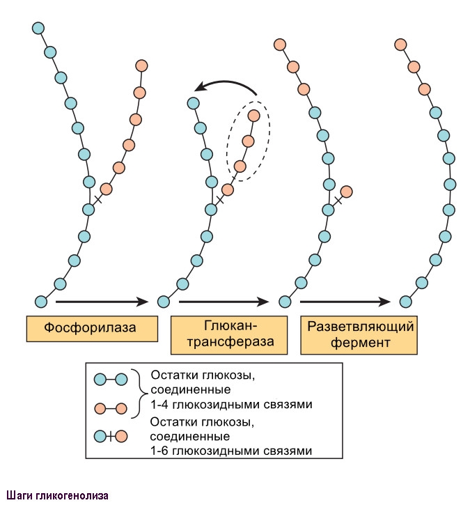 Фосфорилкиназа активируется в ответ на цАМФ. Увеличение концентрации цАМФ активирует цАМФ-зависисимую протеинкиназу, которая каталиризирует фосфорилирование с участием АТФ неактивную фосфорилкиназу b, переходящую в активную фосфорилкиназу а. В печени цАМФ образуется в ответ на глюкагон, секретируемый в ответ на снижение уровня глюкозы в крови. Мышцы не чувствительны к глюкагону, и здесь сигналом для повышения образования цАМФ служит норадреналин, секретируемый в ответ на страх или испуг, когда необходимо увеличить гликогенолиз чтобы обеспечить быструю мышечную активность.