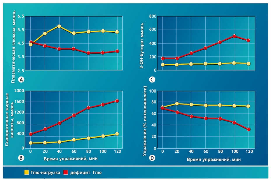 относительной интенсивности нагрузки. Во время низкоинтенсивной нагрузки, жиры служат основным субстратом энергии. По мере продолжения нагрузки и снижения уровня мышечного гликогена, глюкоза крови становится главным источником углеводной энергии, тогда как катаболизм жиров обеспечивает постепенно увеличивающийся процент общей энергии. В итоге, выход печеночной глюкозы не справляется с потреблением глюкозы мышцами, и уровень плазматической глюкозы снижается. В таких случаях, глюкоза крови может достигать гипогликемического уровня.