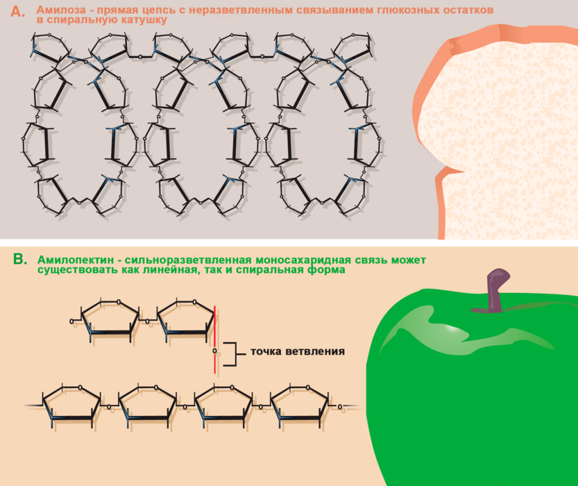 Рис2: Две формы растительного крахмала. А. Прямая цепочка в амилозном крахмале организована в спиральный виток. Амилоза - прямая цепь с неразветвленным связыванием глюкозных остатоков (гликозидная связь). Б. Точка ветвления в высокоразветвленной амилопектиновой крахмальной молекуле. Стурктура амилопектина является линейной, но существует также и в спиральной форме