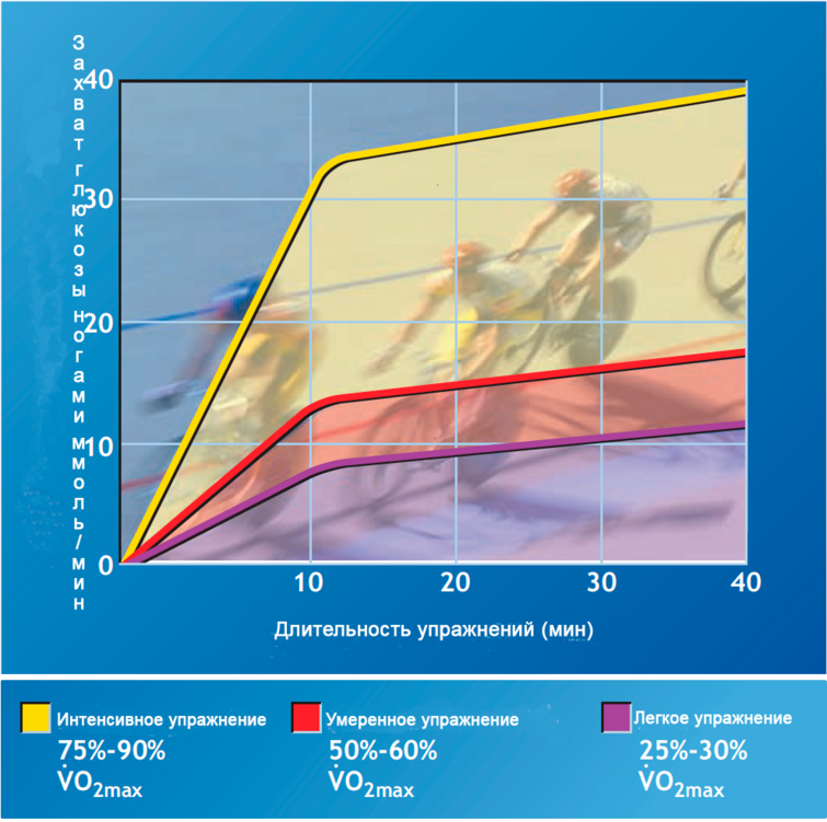 Рисунок ниже демонстрирует, что мышечное потребление циркулирующей глюкозы резко возрастает после начальной фазы циклических упражнений и продолжает увеличиваться по мере продолжения нагрузки. После 40 минут, захват кислорода возрастает с 7 до 20 кратного увеличения от уровня покоя, и зависит от интенсивности нагрузки. Преимущество селективной зависимости от метаболизма углеводов во время интенсивной аэробной нагрузки происходит от скорости получения энергии, которая дважды выше, чем от жиров или протеинов. В дополнение, углеводы производят на 6% больше энергии, чем жиры на литр потребленного кислорода.