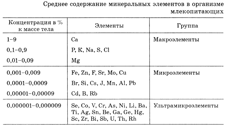 Макроэлементы — содержатся в организма в больших количества (десятки и сотник миллиграмов на 100 г живой ткани или продукта) концентрация в организме превышает 0,01%. К ним относятся O, C, H, N, Ca, P, Ka, Na, S, Cl, Mg. Некоторые элементы этой группы называют «органогенами».