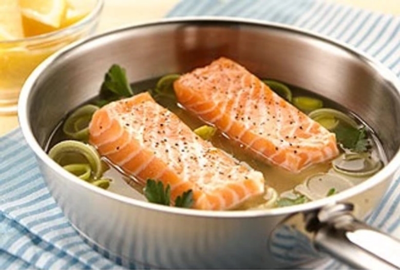 Варка – простой и полезный для здоровья способ приготовления мягкой рыбы такой, как лосось, изображенный на картинке. В неглубокую кастрюлю положите рыбу на ложе из ароматрных ингредиентов, таких как, лук порей или свежие травы и добавьте овощного бульона. Прикройте крышкой и кипятите на небольшом огне на плите. Готовьте от 4 до 6 минут под закрытой крышкой. Время варки может различаться, в зависимости от количества рыбы и ее толщины.
