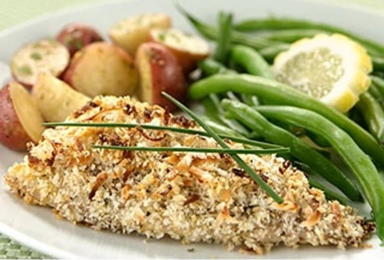 Запекание – здоровая альтернатива жарки. Вы можете панировать и запекать любую рыбу таким образом, но тилапия – это отличный выбор, так как она тонкая и готовится быстро в горячей плите, образуя хрустящую корочку. Для панировки используйте цельнозерновые панировочные сухари, кукурузные хлопья или панко, как показано на картинке.
