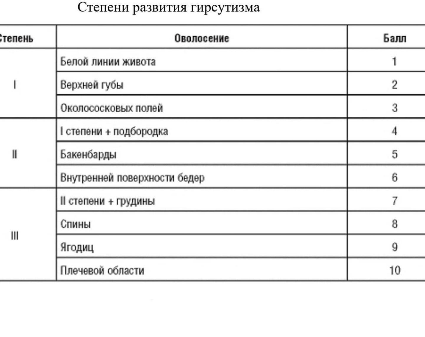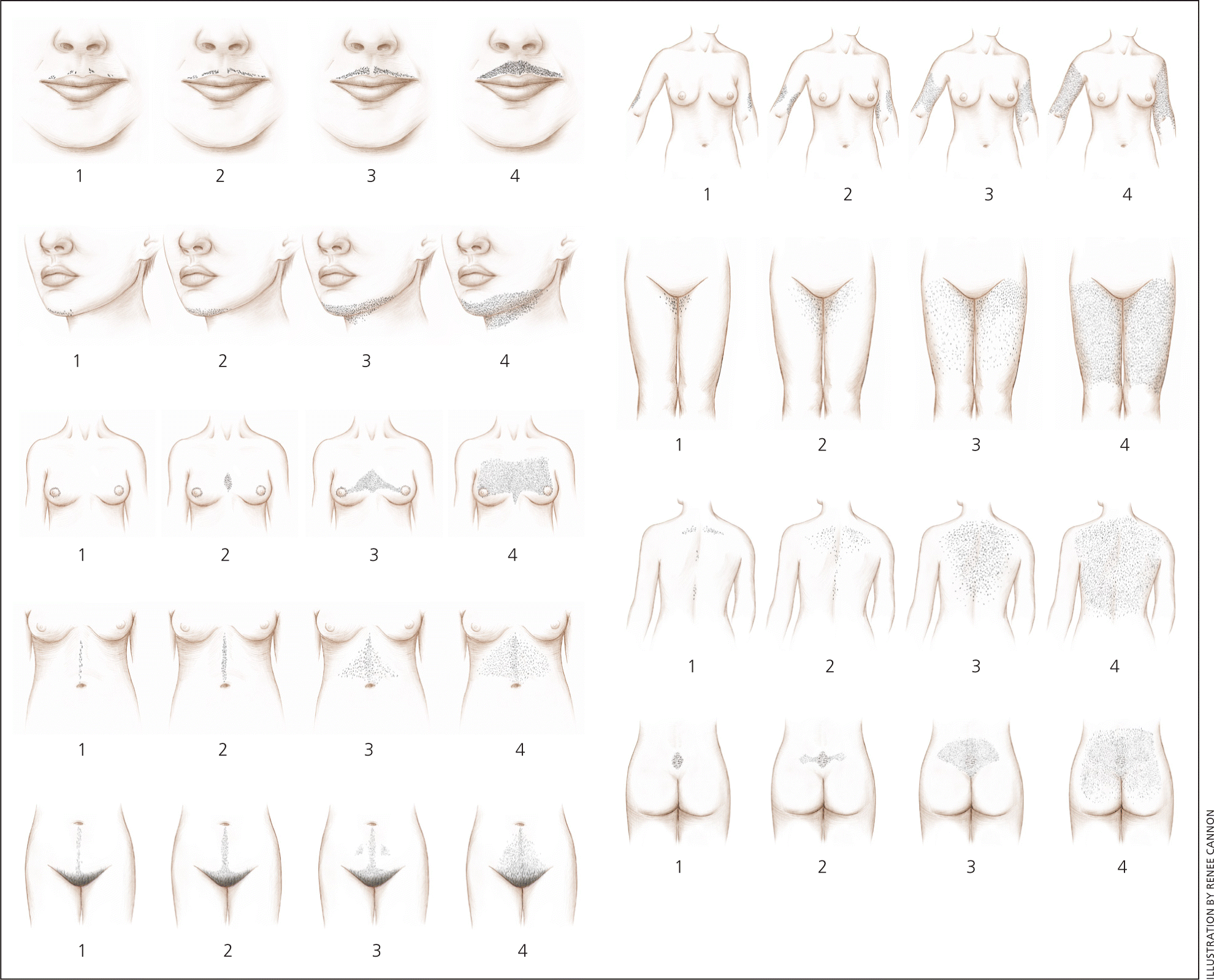 Физикальный осмотр должен начинаться с определения распространения и степени роста волос по шкале Ферримана-Галлвея (Рис 1). У пациента нужно оценить признаки вирилизации, включая клиторомегалию, акне, низкий голос, облысение или потерю типичного женского контура. Абдоманальный или бимануальный осмотр должен быть проведен для определения пальпируемых опухолей. Кожа осмотра на признаки акне, стрий или черный акантоз. Молочная железа должна быть осмотрена на галакторрею. Врач должен также искать другие признаки эндокринопатий, таких как синдром Кушинга или дисфункция щитовидной железы.