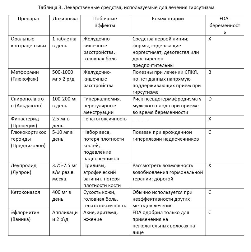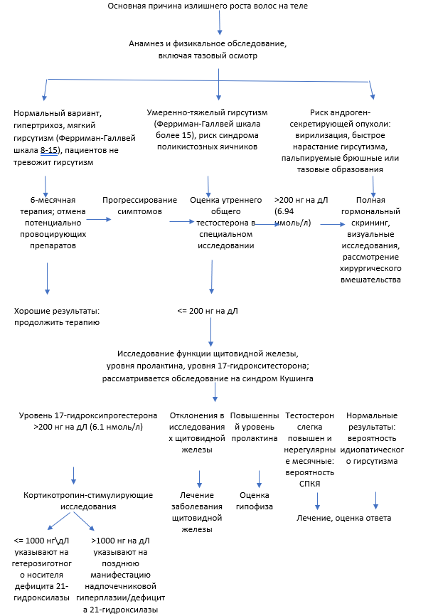 Если возможно, андрогенетические лекарственные средства должны быть отменены. Любой пациент, с быстро развивающимся гирсутизмом, очевидными признаками вирилизации или пальпируемыми абдоминальными или тазовыми опухолями должен быть обследованы на наличие андроген-секретирующей опухоли. В противоположность этому, пациенты с мягкими симптомами гирсутизма или нормальным менструальным циклом не требуют лабораторного обследования и могут начать эмпирическую терапию. Если состояние не улучшается в ответ на терапию или прогрессирует, дальнейшее обследование будет обосновано.