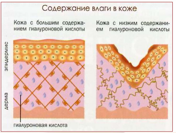 Гиалуроновая кислота - высокомолекулярный полисахарид, является структурным компонентом дермы. Важным физическим свойством ГК является ее высокая вязкость, благодаря чему она играет роль цементирующего вещества, связывающего коллагеновые пучки и фибриллы между собой и с клетками. Пространства между коллагенновыми фибриллами, мелкими сосудами, клетками заняты раствором гиалуроновой кислоты. ГК, обволакивая мелкие сосуды, укрепляет их стенку, предотвращает выпотевание жидкой жидкой части крови в окружающие ткани. Она выполняет во многом опорную функцию, поддерживая сопротивляемость тканей и кожи к механическим факторам. Одна молекула ГК, обладает способностью удержать возле себя около 500 молекул воды.