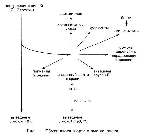 Азот поступает в организм с пищевыми продуктами, в состав которых входят белки и другие азотсодержащие вещества. Эти вещества расщепляются в желудочно-кишечном тракте и затем всасываются в виде аминокислот и низкомолекулярных пептидов, из которых организм человека не способен синтезировать некоторые необходимые для жизни аминокислоты и получают их с пищей «в готовом виде». Конечным продуктом метаболизма азотсодержащих веществ является аммиак NH3. Из организма азот выводится вместе с мочой, калом, выдыхаемым воздухом, а также с потом, слюной и волосами. В моче азот содержится в основном в виде мочевины. Белки в пересчете на сухой вес составляют 44% от массы тела.