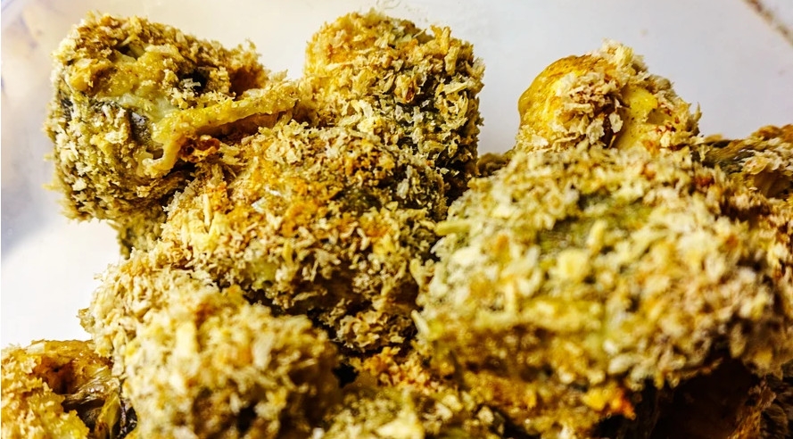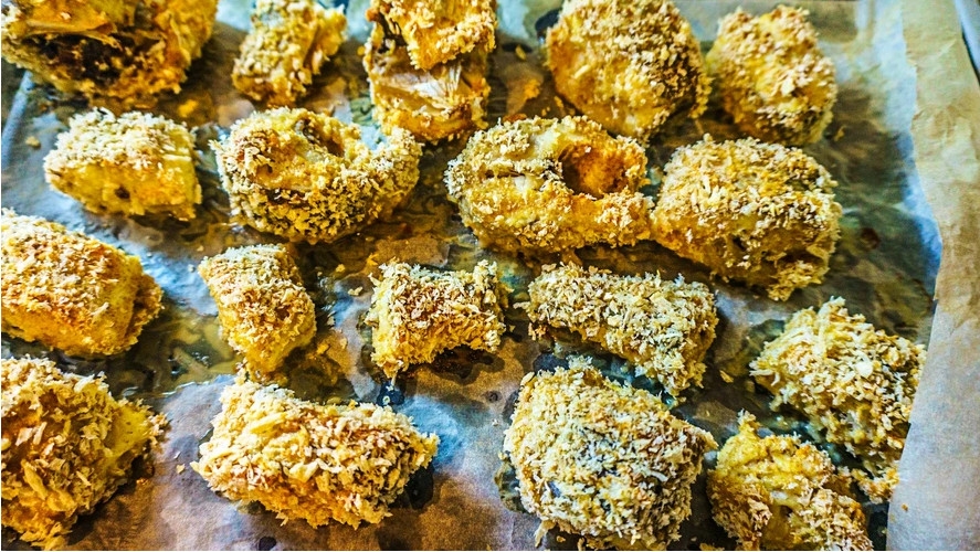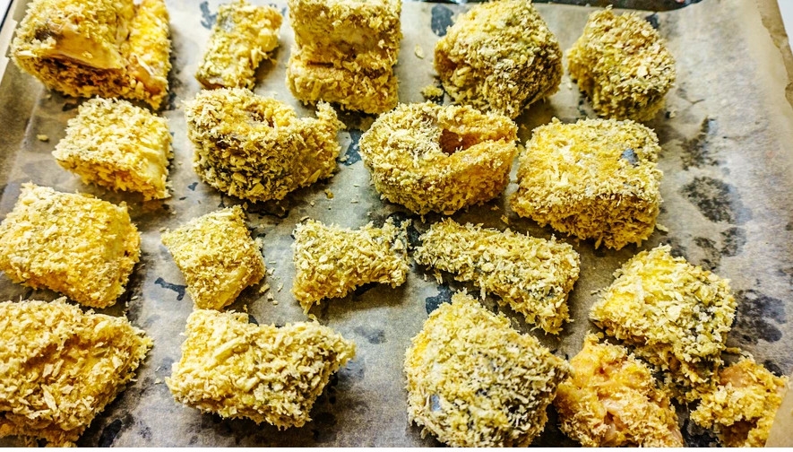 3. Обкатываем кусочки в муке, затем в яйцах, затем в панировочной смеси и выкладываем на противень.