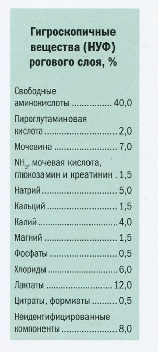 - Компоненты натурального увлажняющего фактора – небольшие молекулы на поверхности роговых чешуек корнеоцитов, обладающие способностью связывать воду.