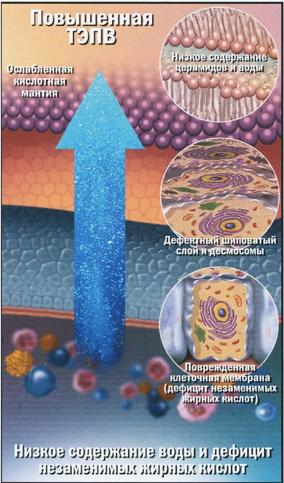 Чтобы сохранить воду в нижних слоях эпидермиса, липидная (гидрофобная) фаза его бислоев должна оставаться неповрежденной. Она является частью барьерной системой: первая линия — кислотная мантия, вторая — корнеоциты, третья — липидные бислои. Любое нарушение этих защитных систем приведет к повышению ТЭПВ, то есть испарению воды. Это в свою очередь снизит активность ферментов и вызовет нарушение процессов отшелушивания корнеоцитов, ухудшит состояние бислоев, снизит объем влаги и спровоцирует появление дефектов кислотной мантии, и в итоге у человека возникает жжение и зуд кожи.