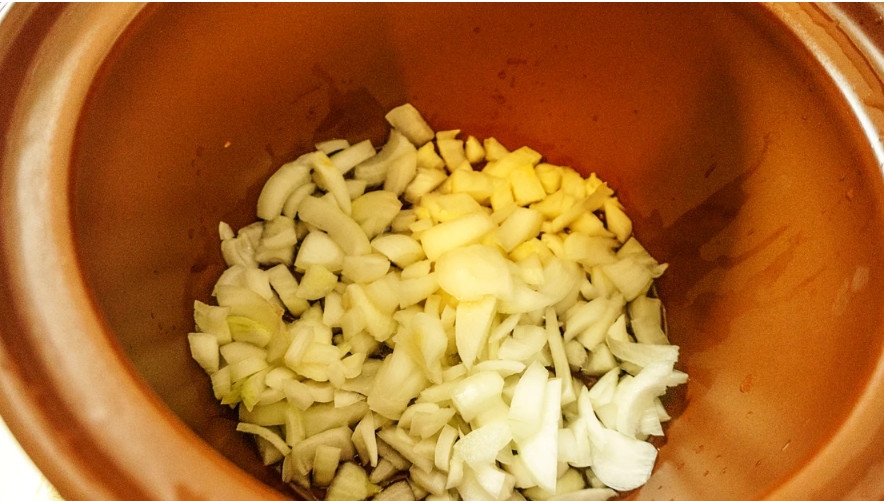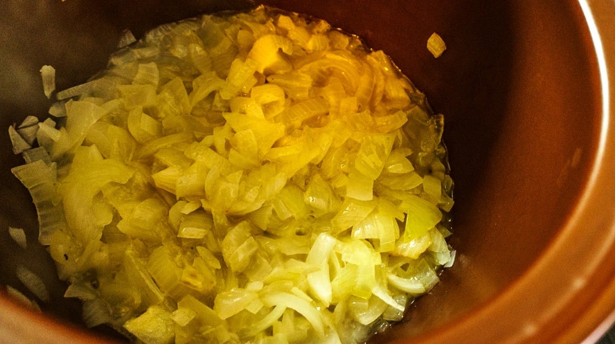1. В большой кастрюле готовить мелко нарезанный лук (готовила на воде, можно добавить масло), пока он не ставит золотистым (около 15 минут)