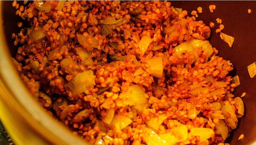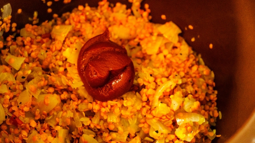3. Добавить томатную пасту, воду (овощной бульон), перец и довести до кипения, пока крупы не станут мягкими и кремообразными (около 1 часа).